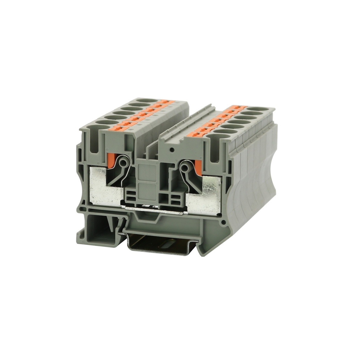 Клемма на дин-рейку, количество точек подсоединения: 2, номинальное напряжение: 1000 В, номинальный ток: 57 A, 10 кв. мм, тип подключения: зажим Push-in, серая.