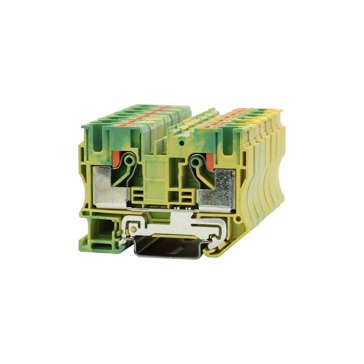 Клемма на дин-рейку, заземляющая, количество точек подсоединения: 2, 10 кв. мм, тип подключения: зажим Push-in, желто-зеленая.