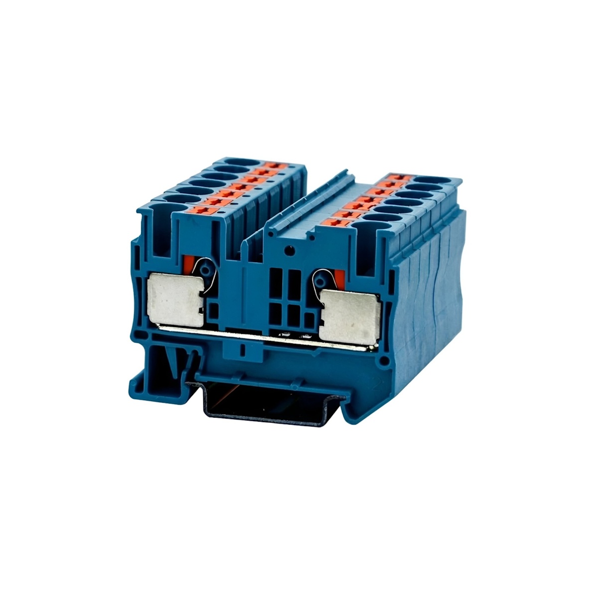 Клемма на дин-рейку, количество точек подсоединения: 2, номинальное напряжение: 1000 В, номинальный ток: 57 A, 10 кв. мм, тип подключения: зажим Push-in, синяя.