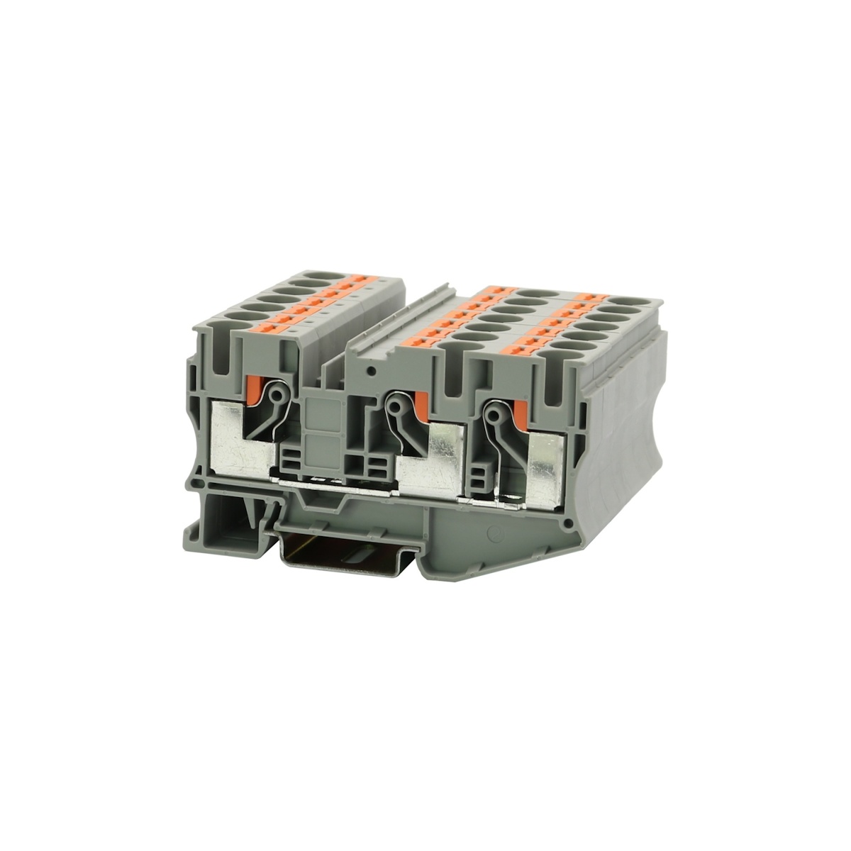 Клемма на дин-рейку, количество точек подсоединения: 3, номинальное напряжение: 1000 В, номинальный ток: 57 A, 10 кв. мм, тип подключения: зажим Push-in, серая.