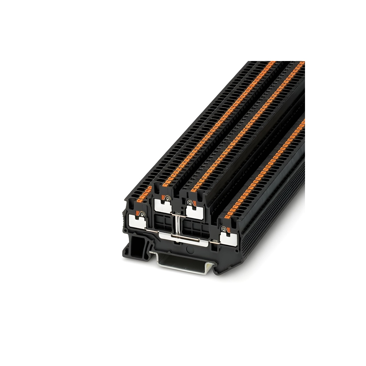 Двухуровневая клемма на дин-рейку, с потенциальным разъемом, количество точек подсоединения: 4, номинальное напряжение: 500 В, номинальный ток: 16 A, 1,5 кв. мм, тип подключения: зажим Push-in, черная.