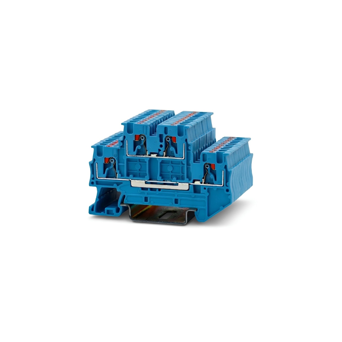 Двухуровневая клемма на дин-рейку, количество точек подсоединения: 4, номинальное напряжение: 500 В, номинальный ток: 16 A, 1,5 кв. мм, тип подключения: зажим Push-in, синяя.