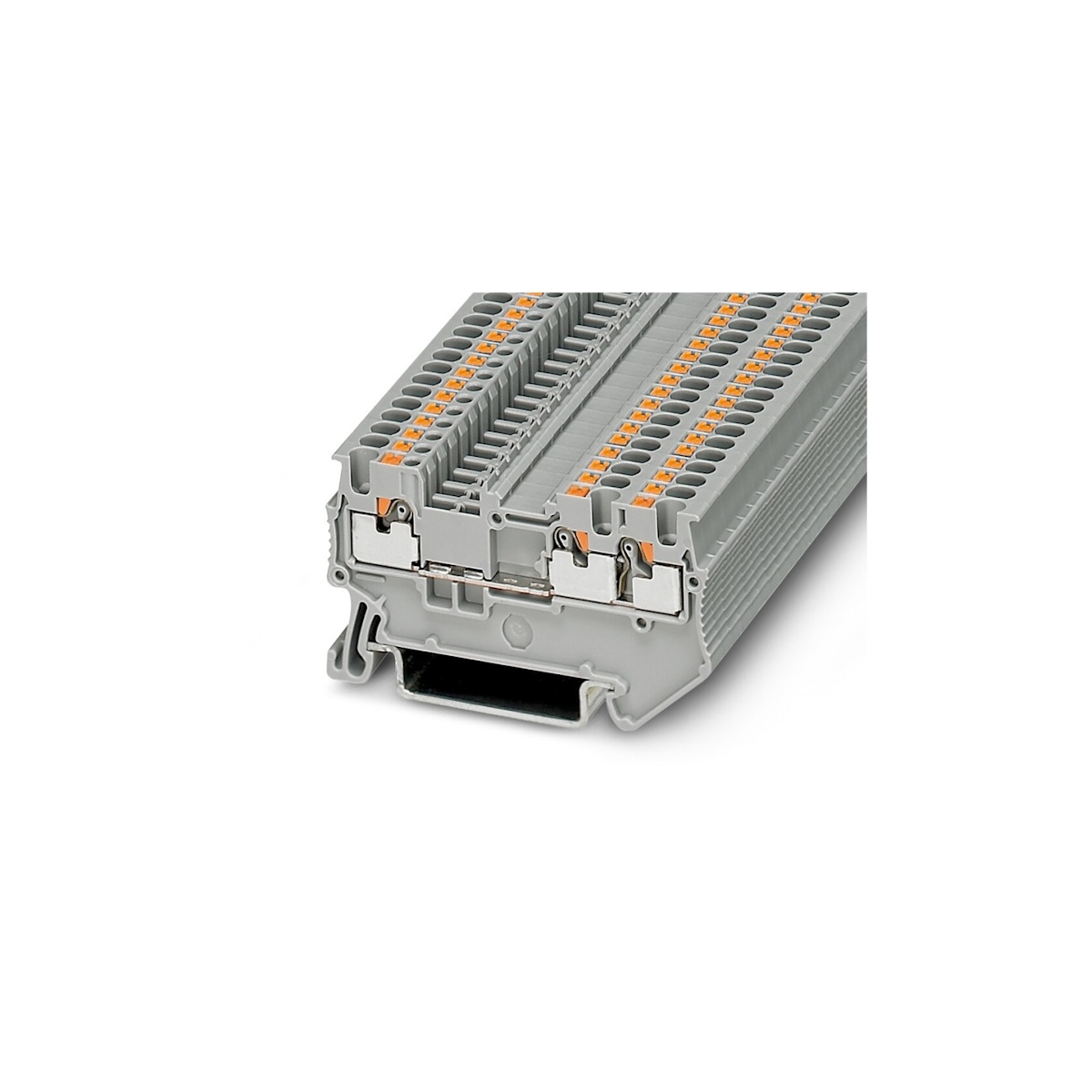 Клемма на дин-рейку, количество точек подсоединения: 3, номинальное напряжение: 500 В, номинальный ток: 17,5 A, 1,5 кв. мм, тип подключения: зажим Push-in, серая.