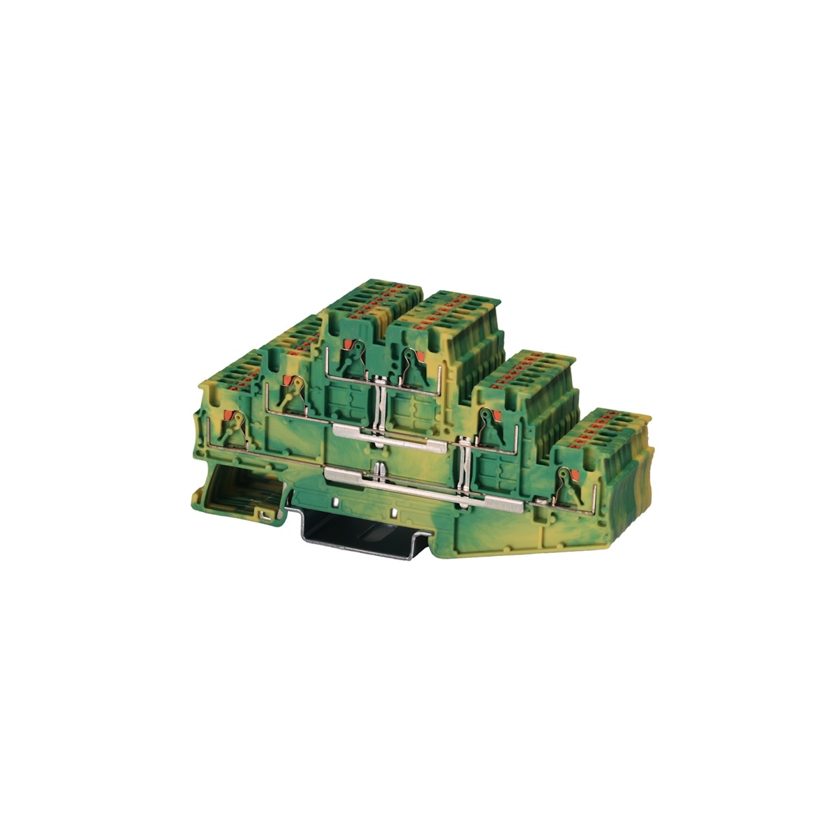 Трехуровневая клемма на дин-рейку, заземляющая, количество точек подсоединения: 6, 1,5 кв. мм, тип подключения: зажим Push-in, желто-зеленая.