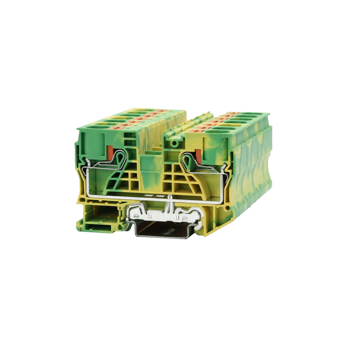 Клемма на дин-рейку, заземляющая, количество точек подсоединения: 2, 16 кв. мм, тип подключения: зажим Push-in, желто-зеленая.