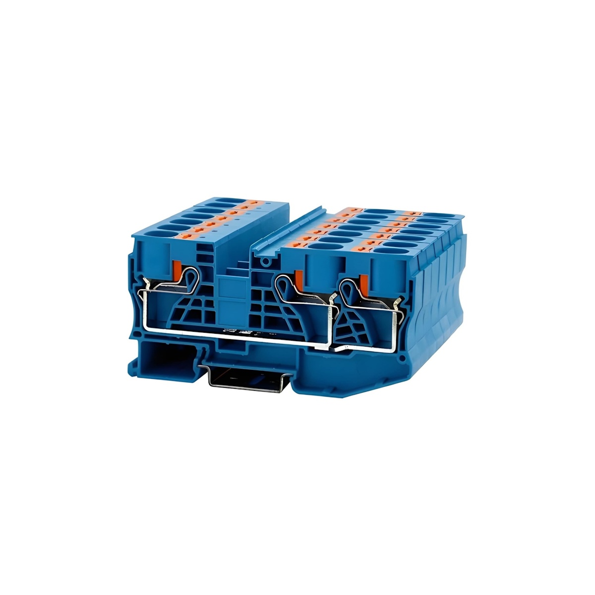 Клемма на дин-рейку, количество точек подсоединения: 3, номинальное напряжение: 1000 В, номинальный ток: 76 A, 16 кв. мм, тип подключения: зажим Push-in, синяя.