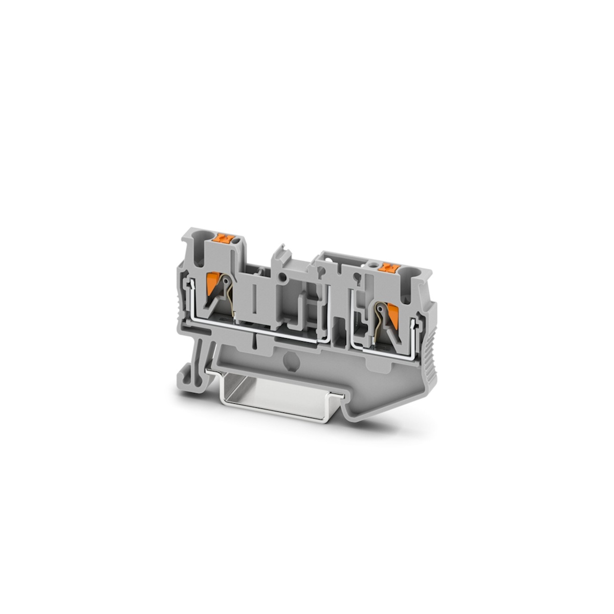 Клемма с разрывом цепи на дин-рейку, количество точек подсоединения: 2, номинальное напряжение: 400 В, номинальный ток: 20 A, 2,5 кв. мм, тип подключения: зажим Push-in, серая.