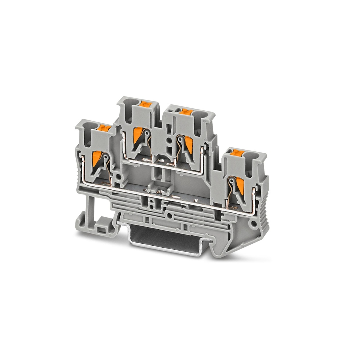 Двухуровневая клемма с контактами "Push-in". Количество точек подсоединения: 4; номинальное сечение: 2,5 мм²; номинальное напряжение: 800 В; номинальный ток: 22 A. Ширина: 5,2 мм. Цвет: серый. Тип монтажа: рейка 35/7,5, 35/15. Рабочий температурный диапазон: -60 °C ... +130 °C.