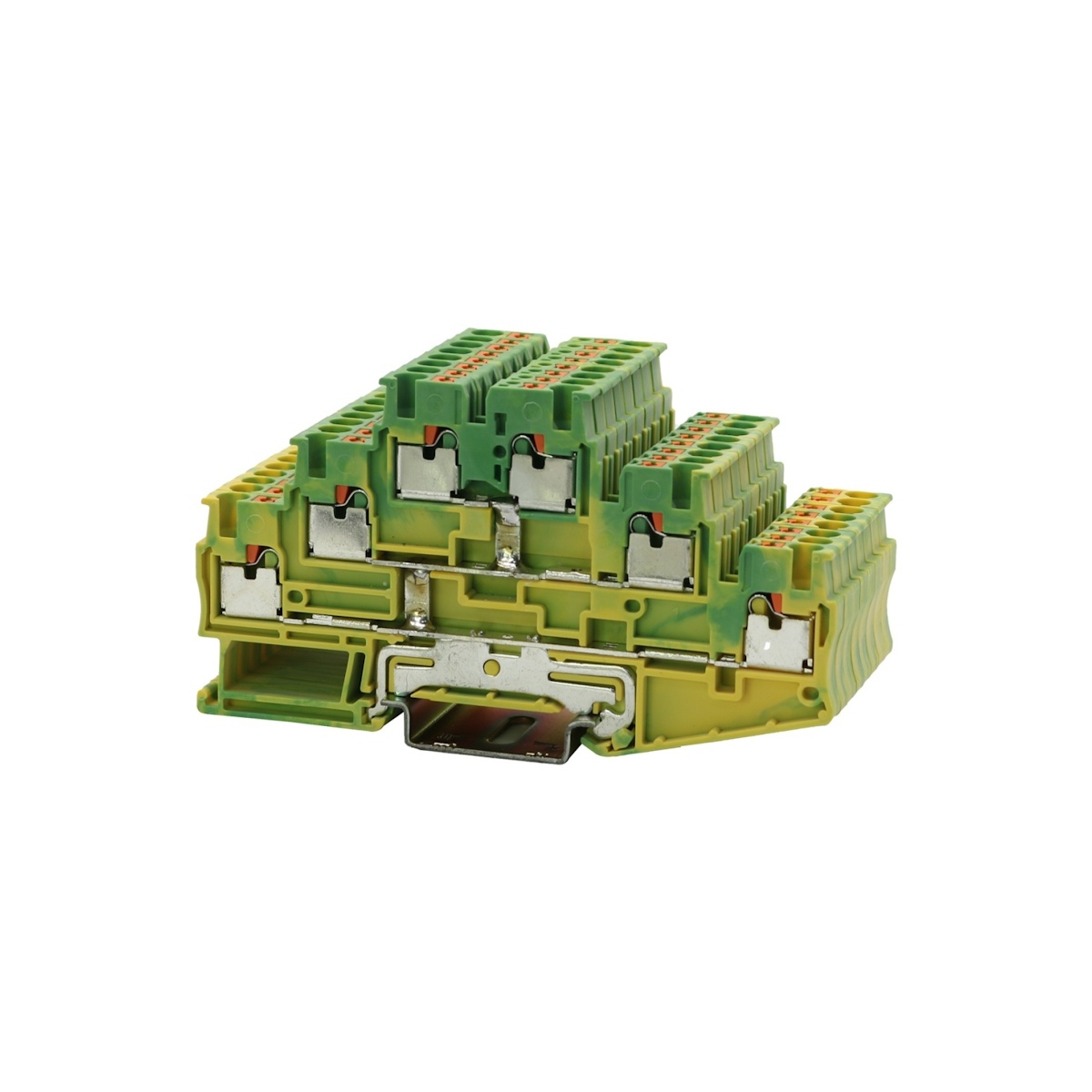Трехуровневая клемма на дин-рейку, заземляющая, количество точек подсоединения: 6, 2,5 кв. мм, тип подключения: зажим Push-in, желто-зеленая.