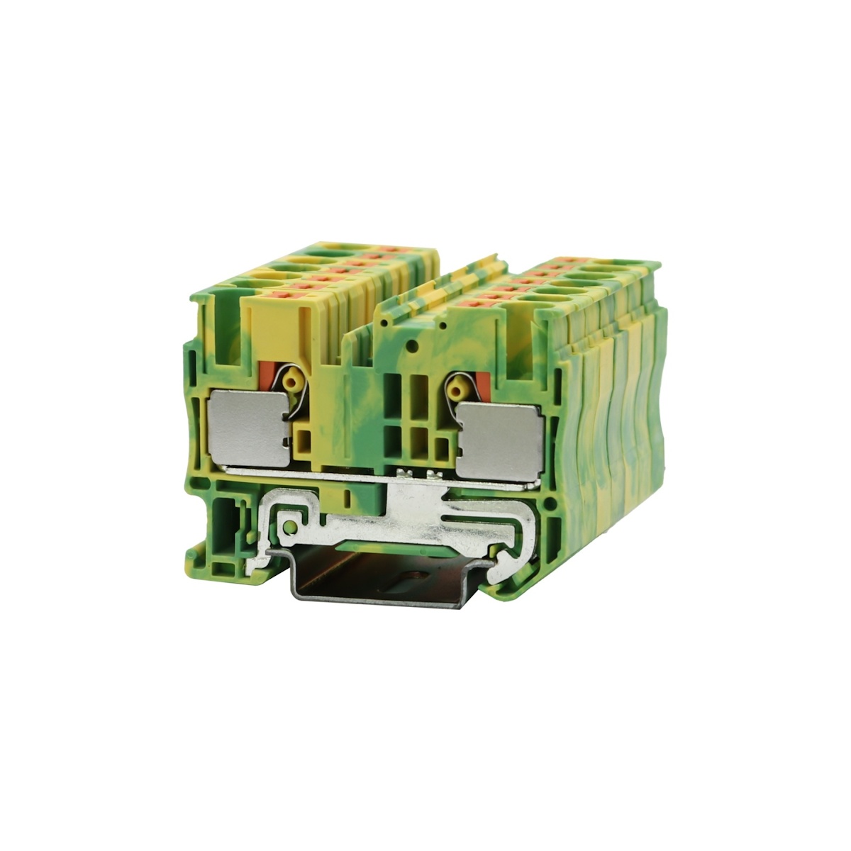 Клемма на дин-рейку, заземляющая, количество точек подсоединения: 2, 6 кв. мм, тип подключения: зажим Push-in, желто-зеленая.
