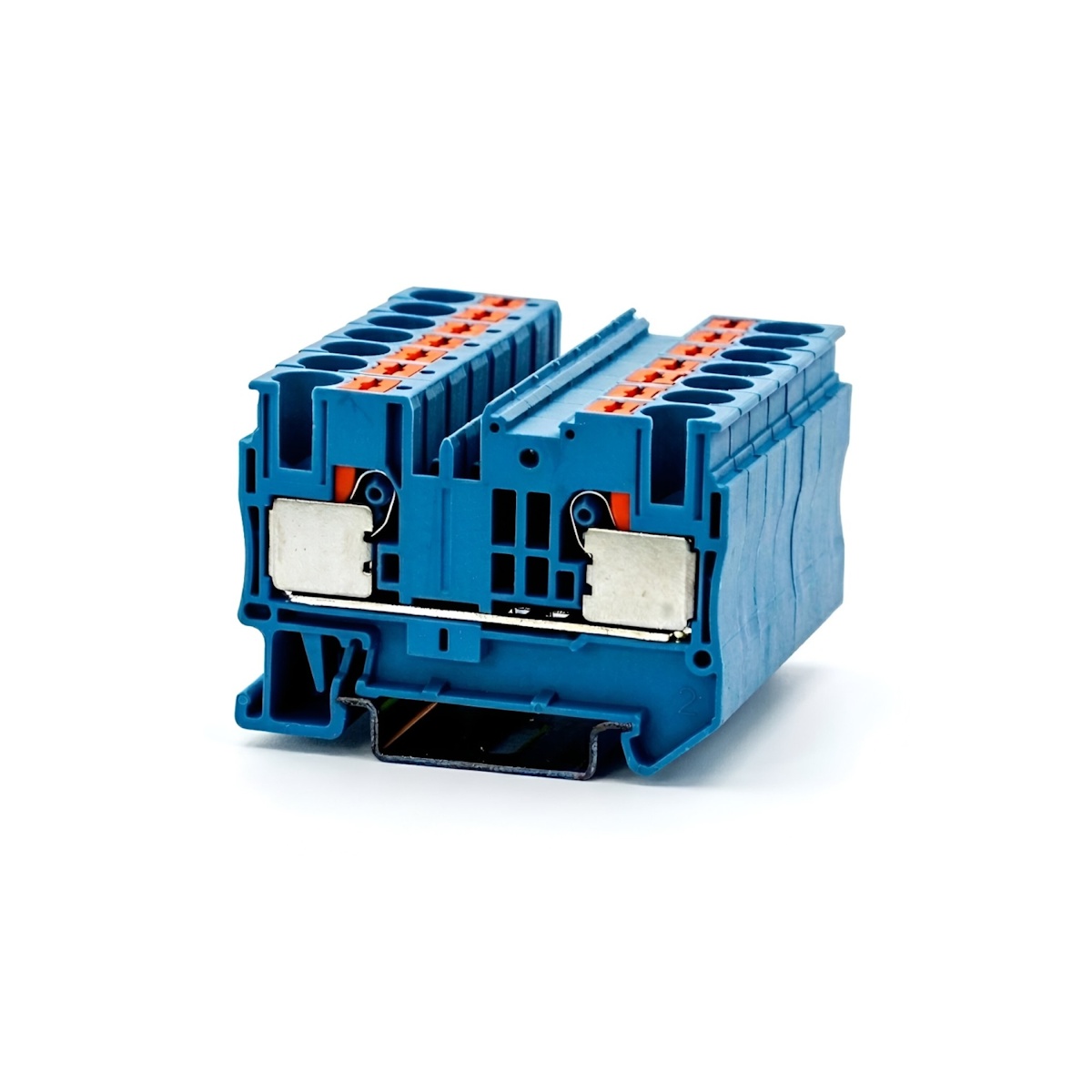 Клемма на дин-рейку, количество точек подсоединения: 2, номинальное напряжение: 1000 В, номинальный ток: 41 A, 6 кв. мм, тип подключения: зажим Push-in, синяя.