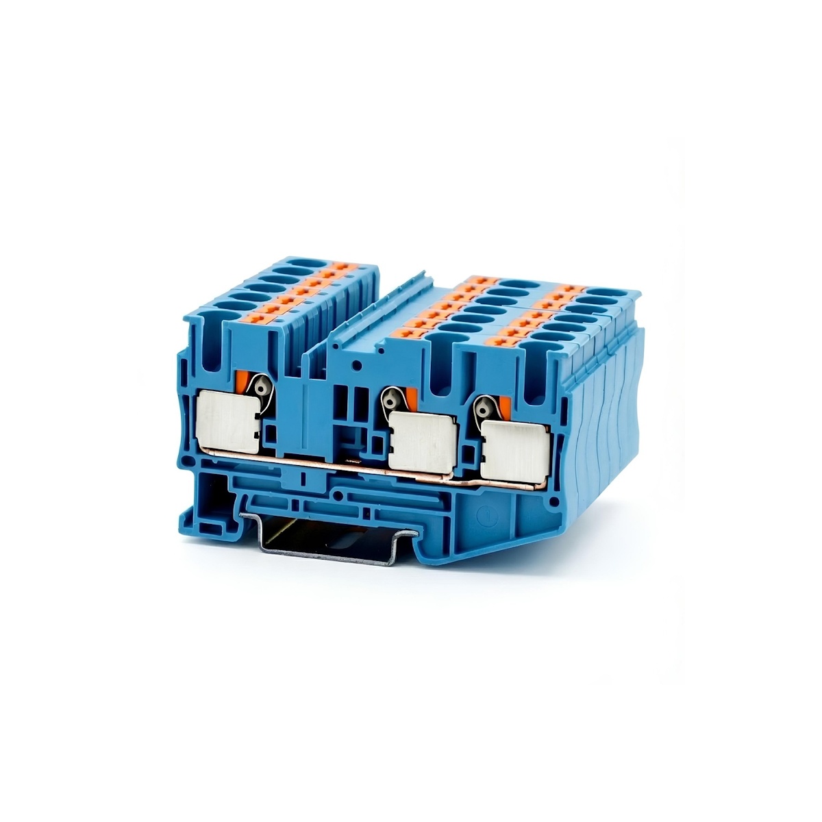 Клемма на дин-рейку, количество точек подсоединения: 3, номинальное напряжение: 1000 В, номинальный ток: 41 A, 6 кв. мм, тип подключения: зажим Push-in, синяя.