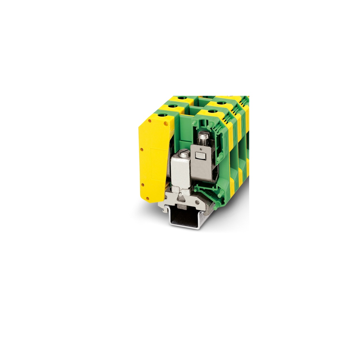 Клемма на дин-рейку, заземляющая, количество точек подсоединения: 2, 50 кв. мм, винтовая, желто-зеленая.