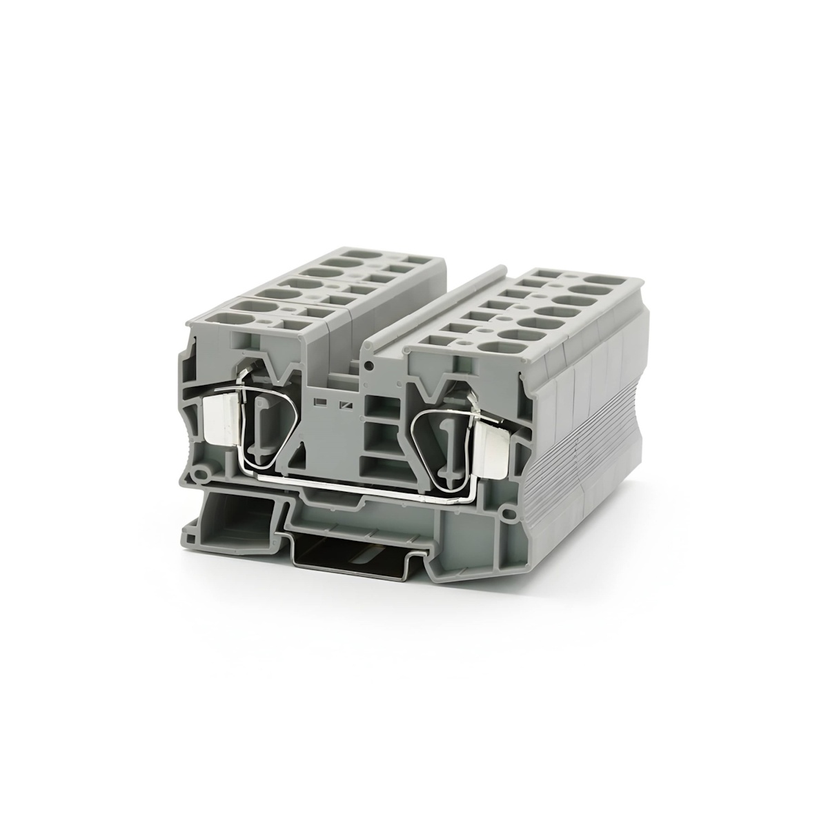 Клемма на дин-рейку, количество точек подсоединения: 2, номинальное напряжение: 800 В, номинальный ток: 90 A, 16 кв. мм, пружинная, серая.