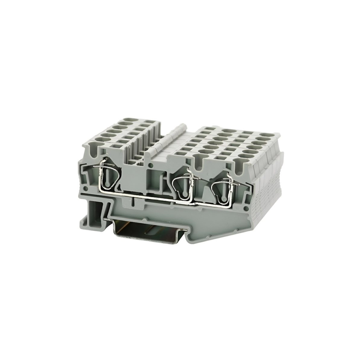 Клемма на дин-рейку, количество точек подсоединения: 3, номинальное напряжение: 800 В, номинальный ток: 32 A, 4 кв.мм, пружинная, серая.
