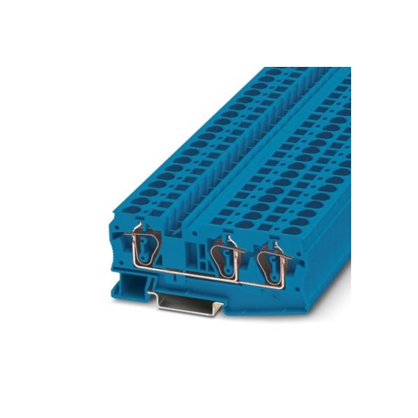 Клемма на дин-рейку, количество точек подсоединения: 3, номинальное напряжение: 800 В, номинальный ток: 52 A, 6 кв. мм, пружинная, синяя.