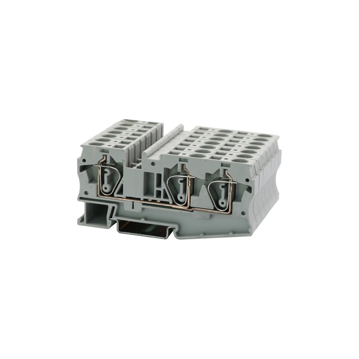 Клемма на дин-рейку, количество точек подсоединения: 3, номинальное напряжение: 800 В, номинальный ток: 52 A, 6 кв. мм, пружинная, серая.